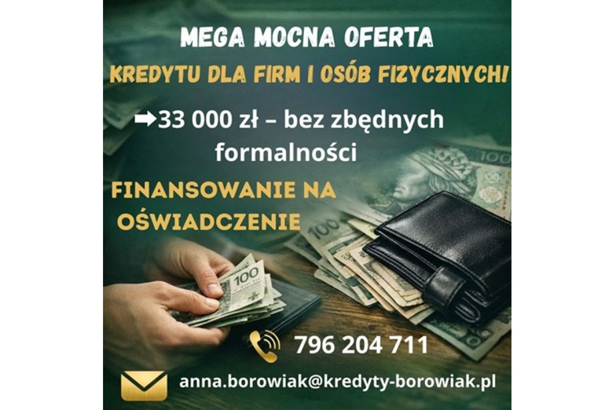MEGA MOCNA OFERTA KREDYTU DLA FIRM I OSÓB FIZYCZNYCH NA OŚWIADCZENIE!